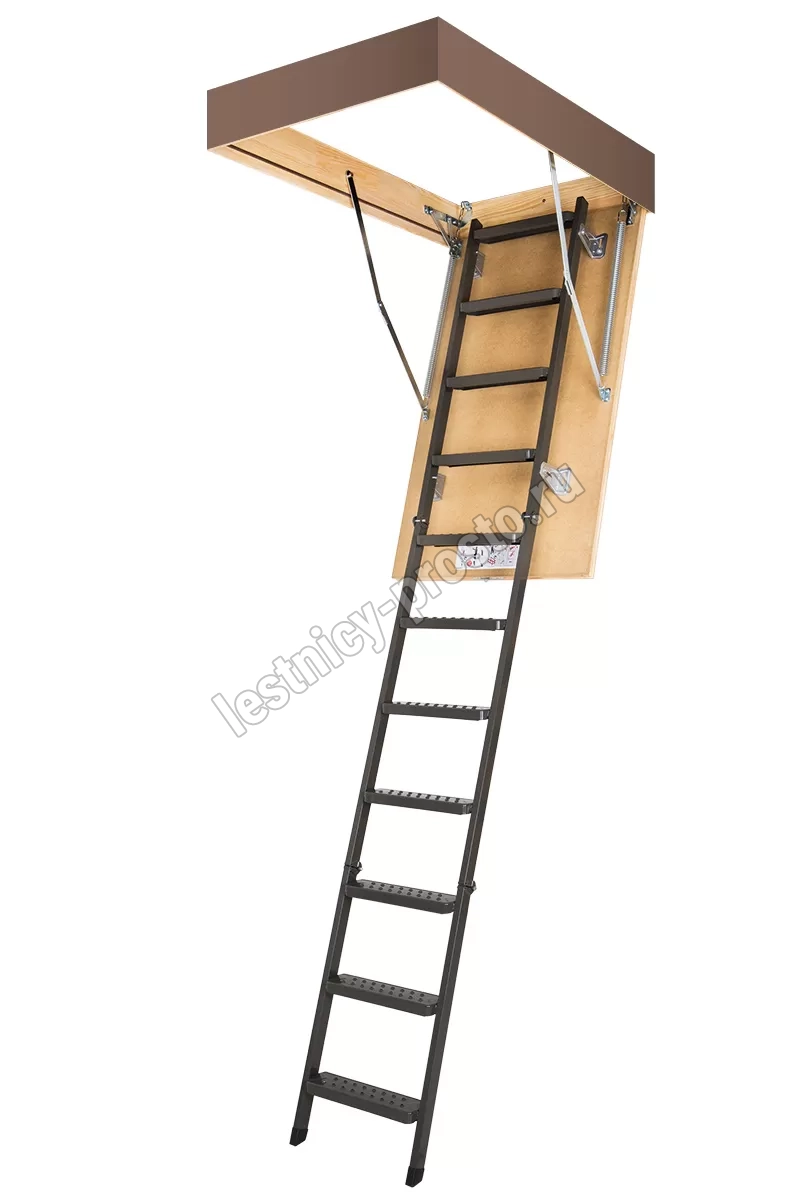 Чердачная металлическая лестница LMS – это надежная складная конструкция, состоящая из марша и термоизоляционной крышки, изготовленной из ДВП и окрашенной в бежевый цвет. Герметичность всей конструкции достигается благодаря утеплению крышки люка и контурному уплотнению по периметру, что предотвращает возможные теплопотери. Чердачную лестницу очень легко разложить и сложить благодаря наличию специального стержня с четырехугольной насадкой.