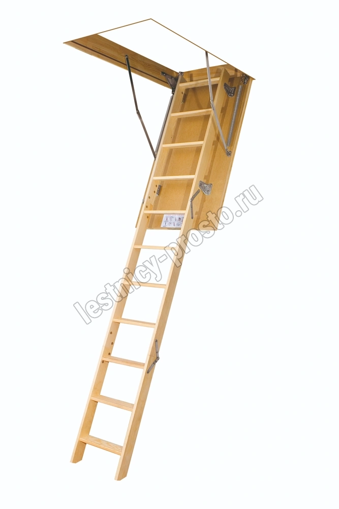 Деревянная чердачная лестница LWS изготовлена из древесины сосны и укомплектована утепленной крышкой, облицованной ДВП бежевого цвета (толщина крышки люка с утеплителем – 36 мм). Крышка люка крепится металлическими шарнирами, которые позволяют регулировать длину лестницы (макс. 40 мм). Для транспортировки лестница снижается в пазах, перед использованием необходимо отодвинуть лестничный марш от плиты люка.