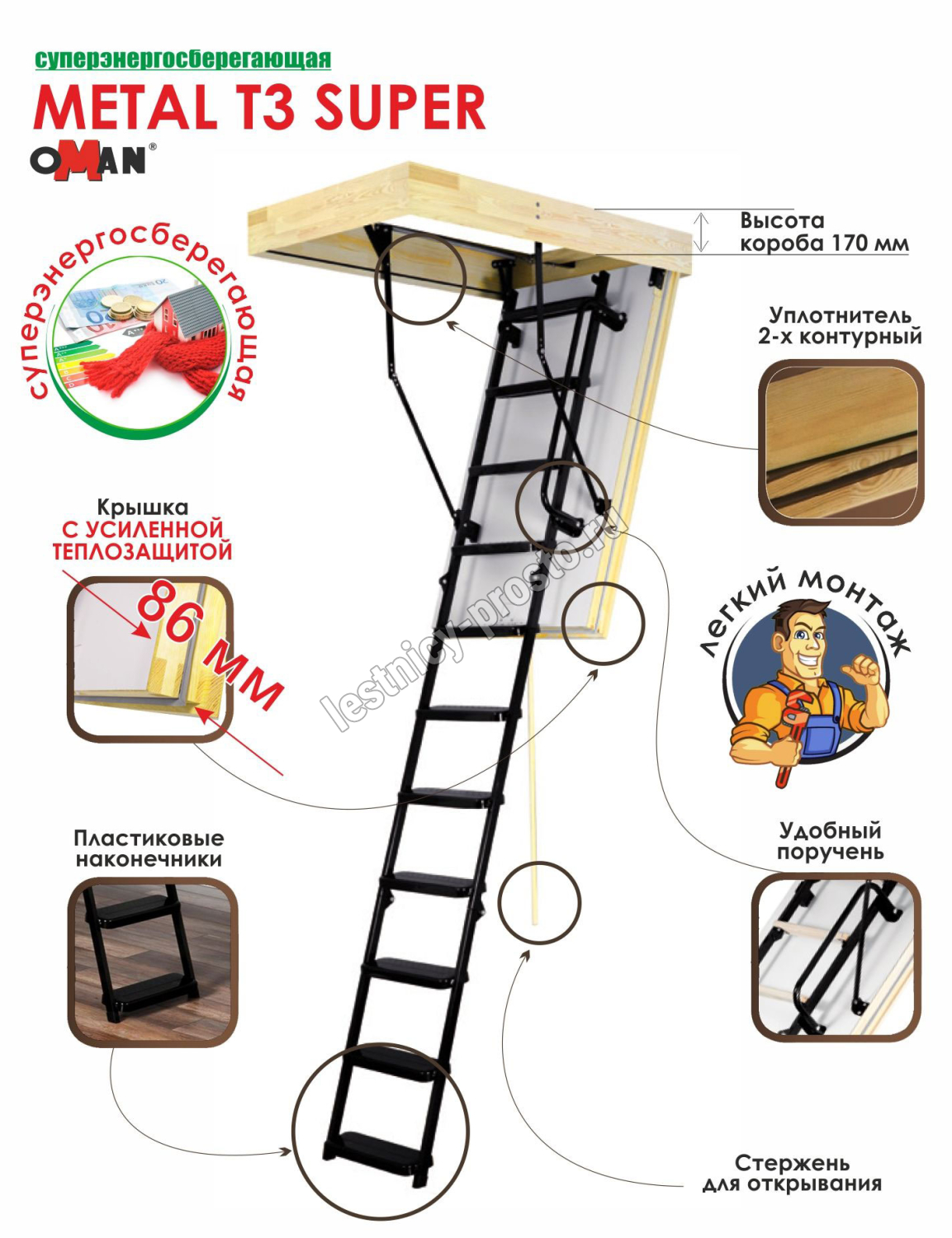 Чердачная лестница OMAN Metal T3 SUPER 55×130 см, h-280 см