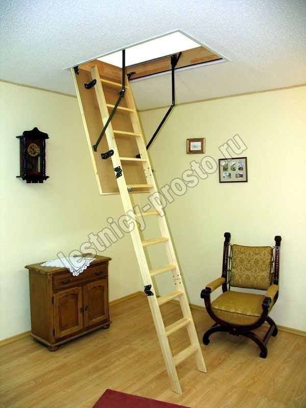 Специальные пружинные механизмы позволяют открывать и закрывать люк плавно. Лестницу легко собрать самостоятельно.