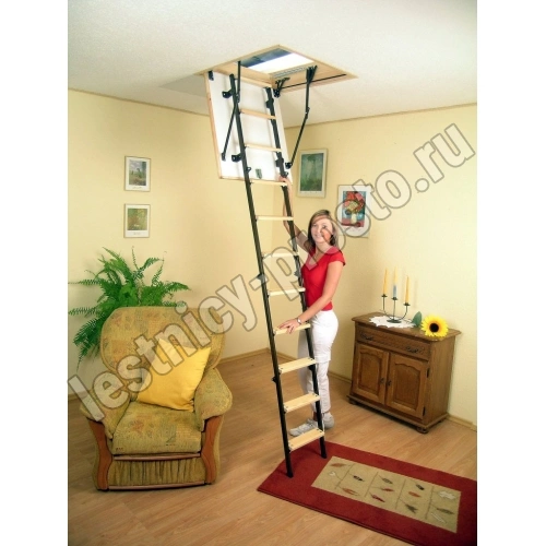 Модель STALLUX идеально подходит для условий, когда чердак утеплен и не требует дополнительной теплоизоляции. Направляющие изготовлены из стали, а ступени - из сосны. Термоизоляционная крышка типа "сэндвич", толщиной 30 мм, утеплена пенопластом, облицована с двух сторон ДВП белого цвета.