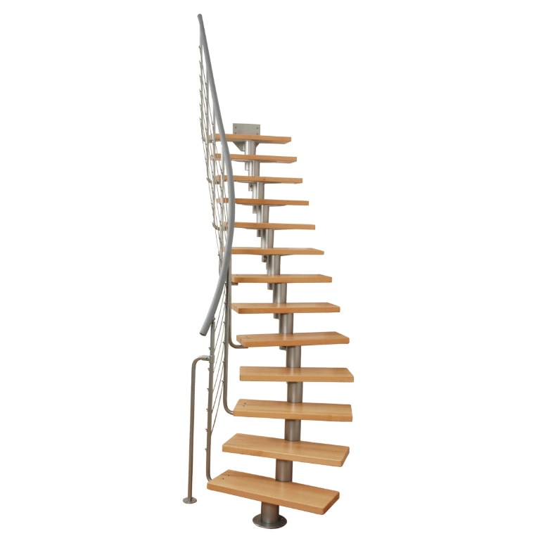Удобная лестница на косоурах с поворотом на 90 градусов. Открытые ступени визуально облегчают конструкцию. Ограждения по всему маршу обеспечивают дополнительную безопасность и возможность декорирования. Монтаж осуществляется силами двух человек на объекте по указаниям, приведенным в паспорте на лестницу.