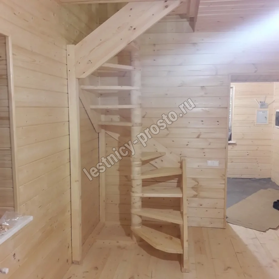 Небольшая аккуратная лестница, хорошо подойдет для помещения с небольшим проемом, поможет сэкономить пространство и организовать комфортный подъем на  уровень выше. Возможны варианты лестницы из сосны под покраску, сосны, дуба, бука или ясеня. Для увеличения срока эксплуатации мы рекомендуем покрыть элементы лестницы защитным средством. Вы можете сделать это самостоятельно или заказать предварительное покрытие необходимым средством (или тонирование) в нашем цеху.