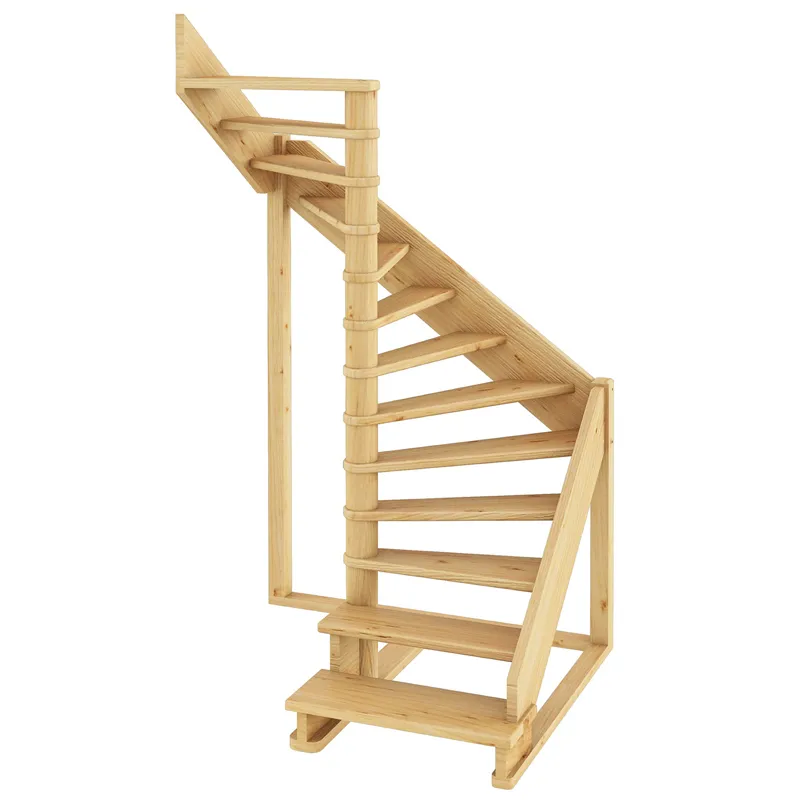 Есть возможность регулировать высоту ступеней. В комплект входят перила с вертикальными стойками и горизонтальными перегородками.