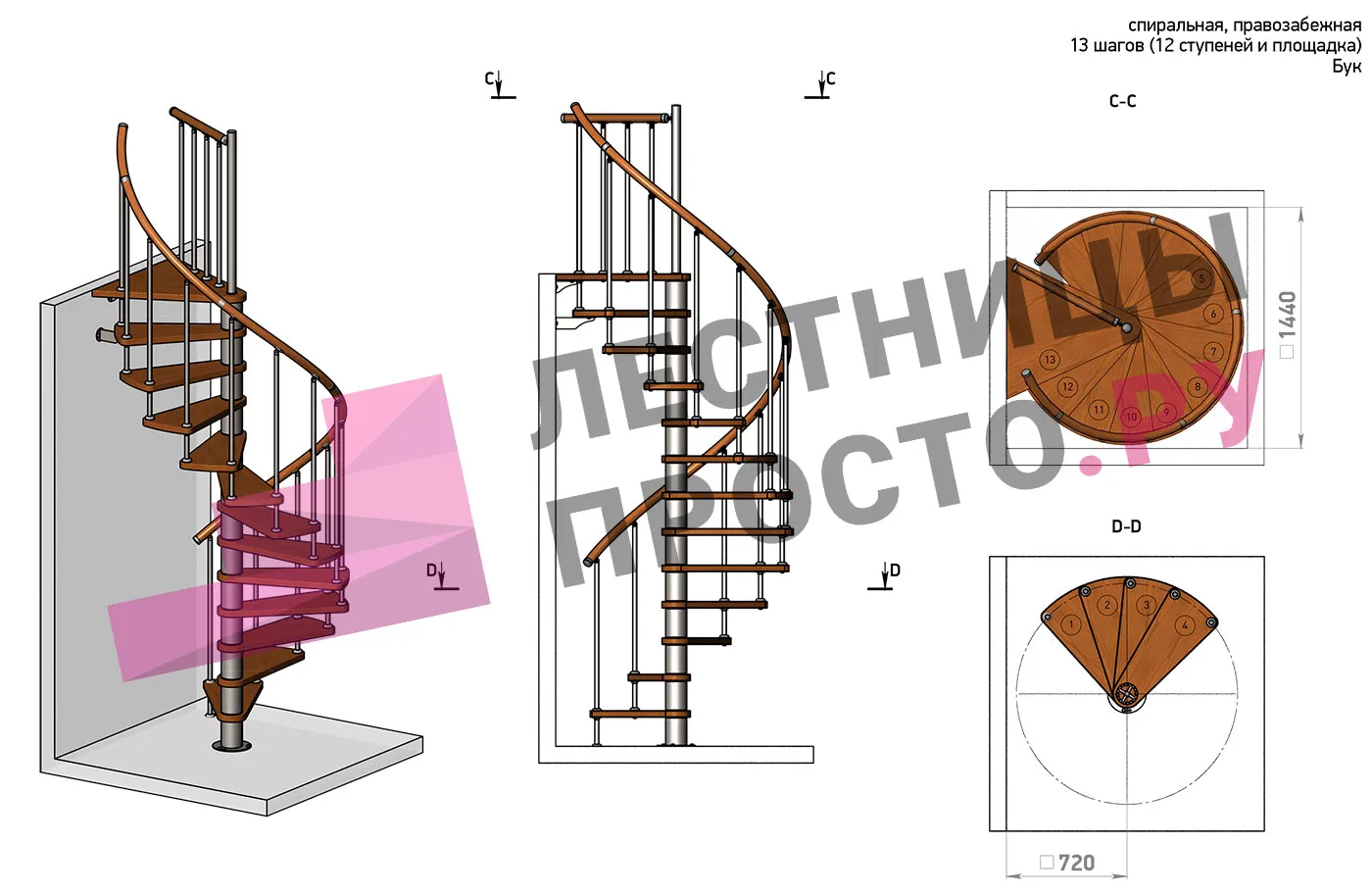 Ширина ступени между центральной колонной и поручнем ≈ 580 мм