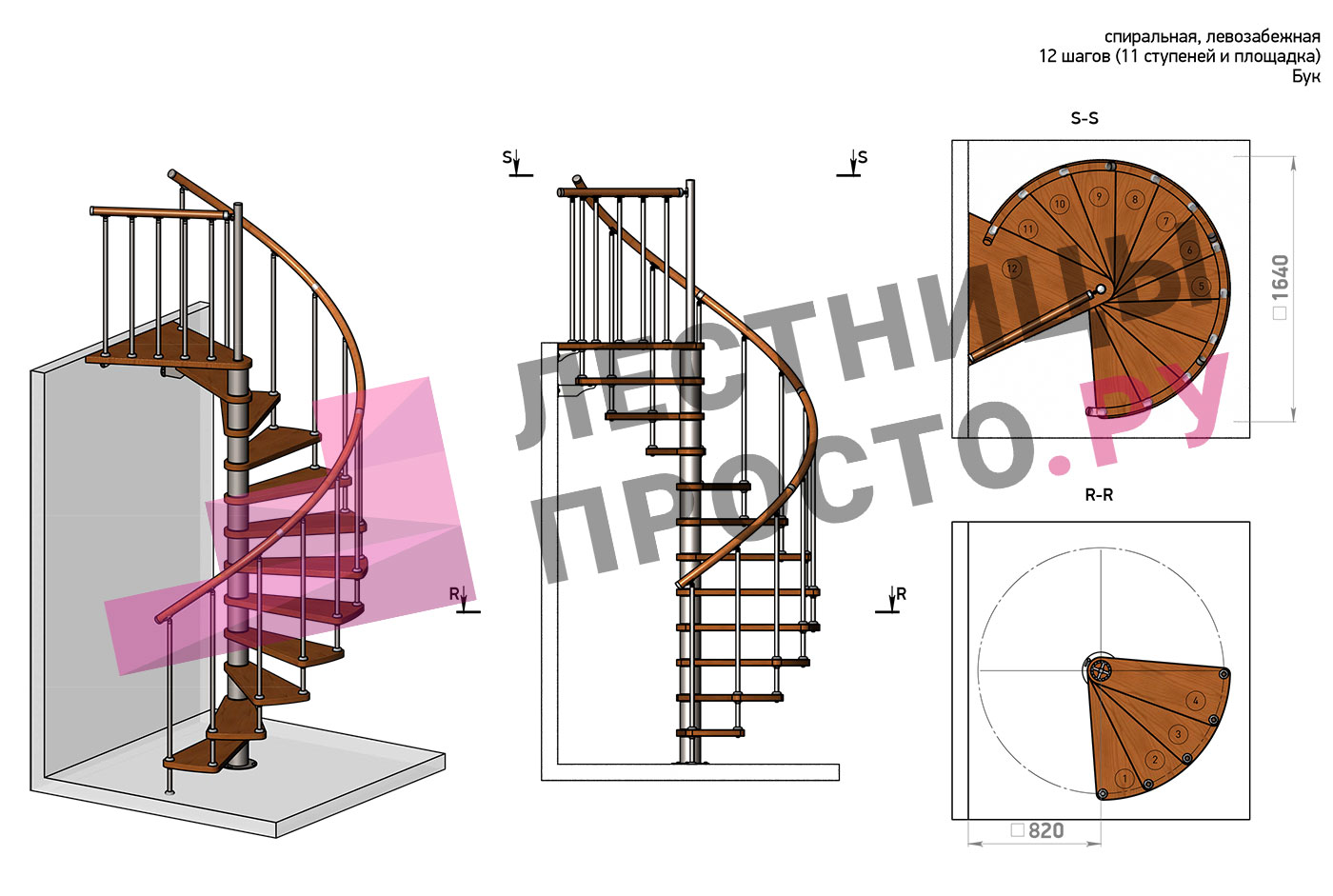 Правая, d=160см, 11 ступеней + площадка