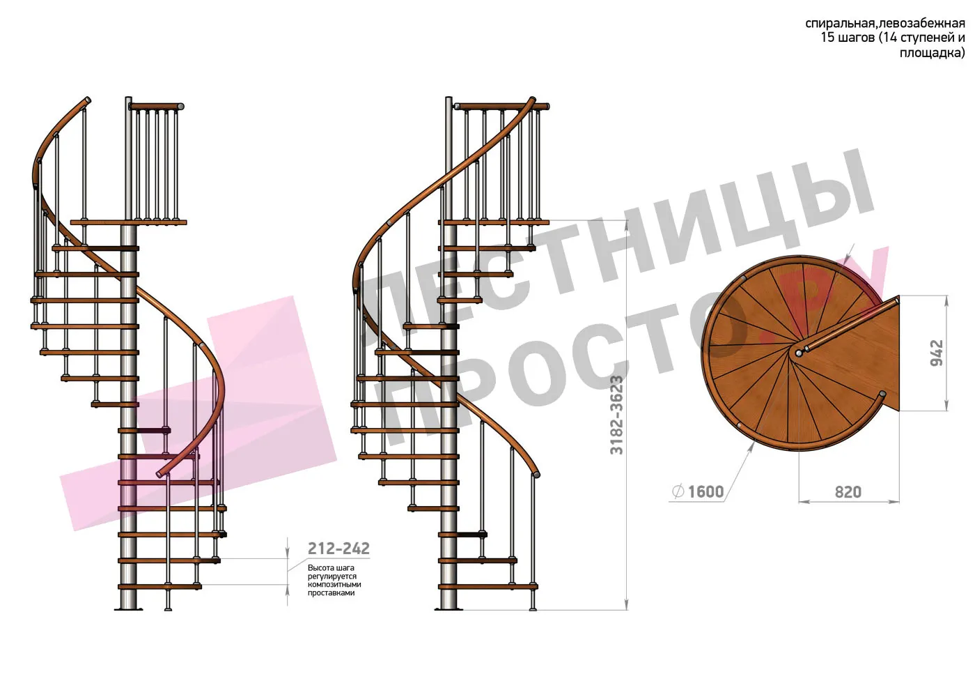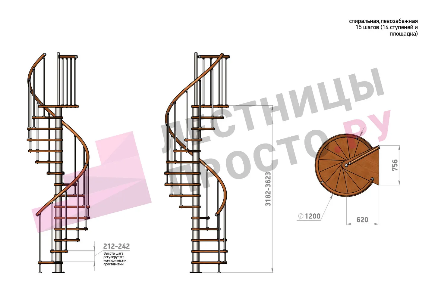 Высота ступеней регулируется с шагом 3 мм. в пределах 212-242 мм., благодаря чему, лестница прекрасно подгоняется под необходимую высоту.