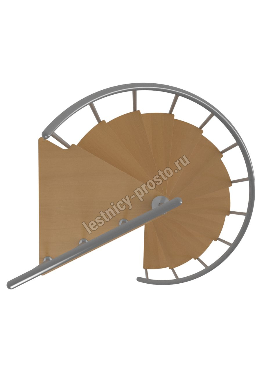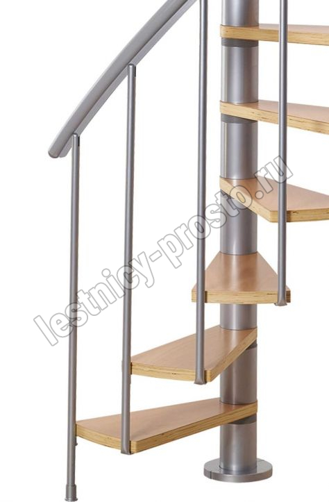 Ступени лестницы изготовлены из бука по технологии MULTIPLEX и покрыты износостойким защитным лаком. Лестница монтируется как по часовой стрелке, так и против. Возможен монтаж в круглый или квадратный проём. Ограждение: стальные трубки, Ø25 мм RAL 9006. Поручень: гибкий цельный ПВХ-поручень Ø40 мм серого цвета. Конструкция и балюстрада окрашены порошковым способом в серый цвет (RAL 9006).